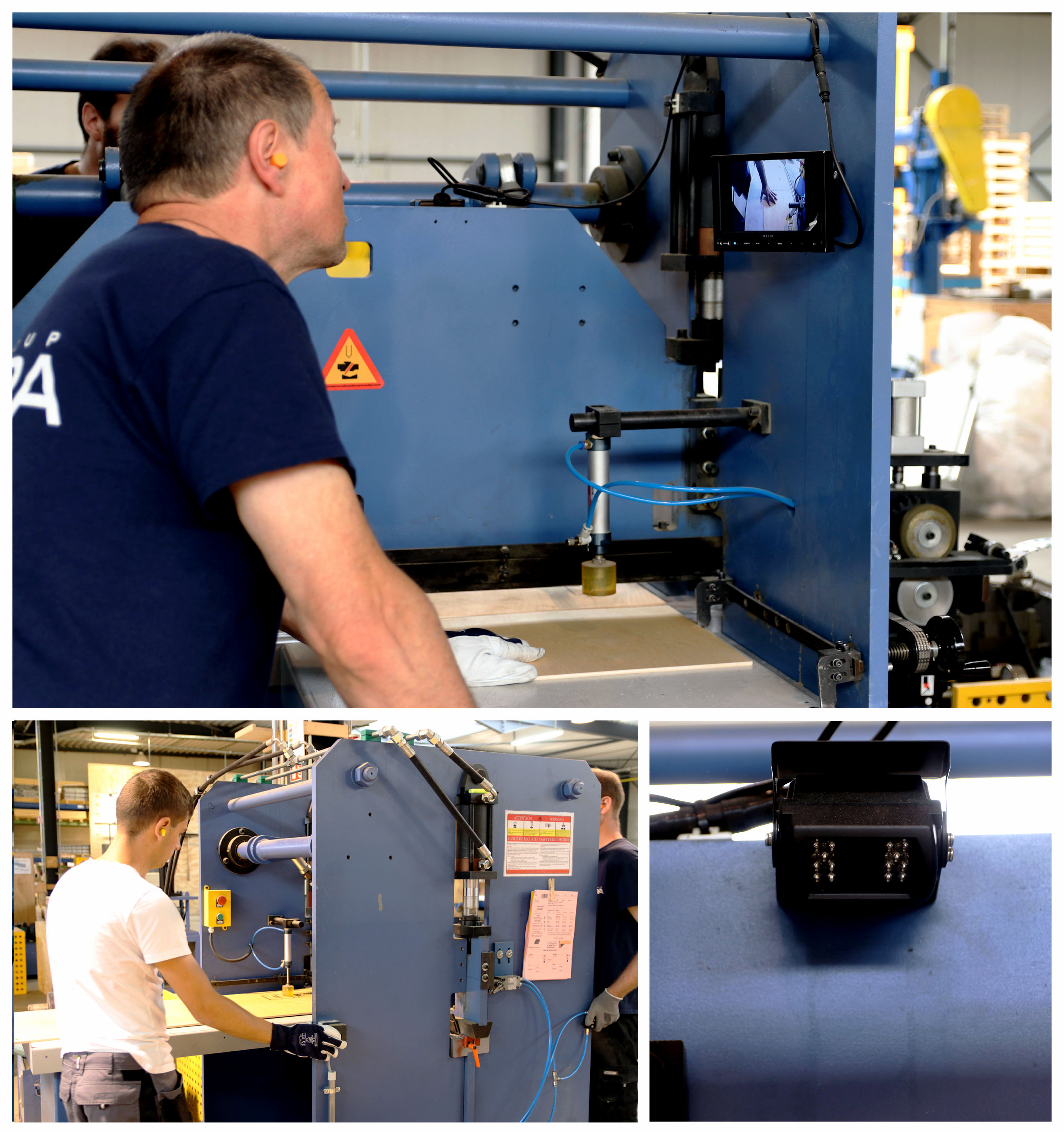 Sur la machine d’assemblage des caisses pliantes ISIBOX (photo ci-contre), le service de maintenance a perfectionné le système de sécurité existant pour garantir au maximum l’intégrité du personnel. L’opérateur doit désormais appuyer sur un bouton de sécurité pour que son collègue puisse actionner la presse. Une caméra a également été ajoutée. Ainsi, l’opérateur qui actionne la presse a également une vue sur son collègue.